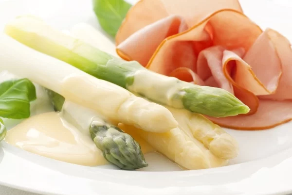 Die leckerste Art den fein-herben Spargel zu genießen ist, ihn mit herzhaft-saftigem Hinterschinken zu umwickeln, dazu eine feine Sauce Hollandaise und dampfende Pfälzer Salzkartoffeln und fertig ist das festliche Gericht.