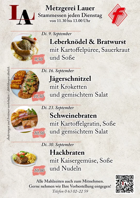 Di. 9. Sept. | Leberknödel & Bratwurst mit Kartoffelpüree, Sauerkraut & Soße | 9,50 € |