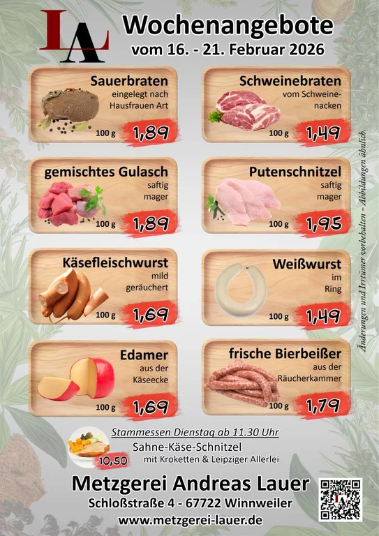 | Schweinbraten vom Nacken | 100 g | 1,49 € |