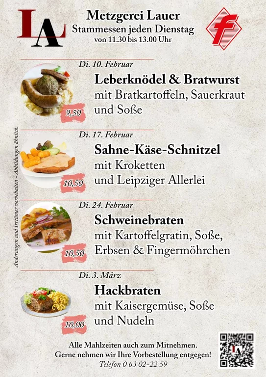| Di. 10. Feb. | Leberknödel & Bratwurst mit Bratkartoffeln, Sauerkraut & Soße | 9,50 € |
